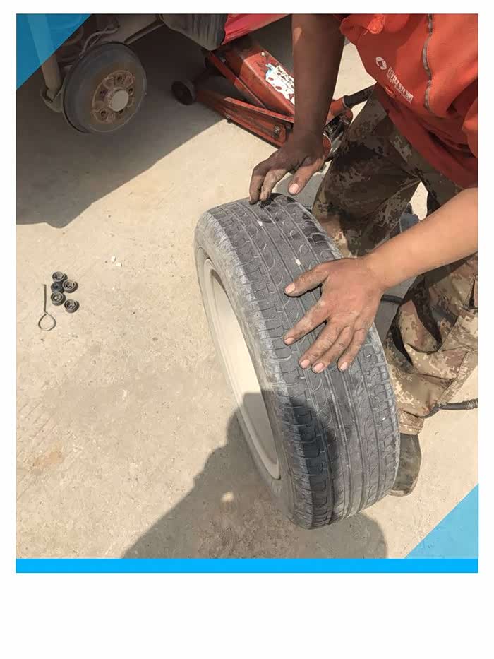 安装轮胎,把轮毂和车轮轴承的位置对转装上后,师傅用腿顶住车轮,然后依次把5个固定螺丝用手拧在固定位置上。