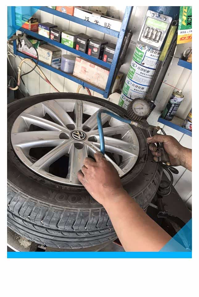 开始给轮胎充气了,充气的时候我站在旁边看胎压表的度数,突然砰的一声,着实吓了一跳,师傅说这是正常现象,他们整天补胎已经习惯了,观察胎压表当胎压达到2.3bar的时候停止充气,因为现在天气越来越热,轮胎的胎压值选择正常值中比较低的胎压,2.3bar可以满足使用条件。