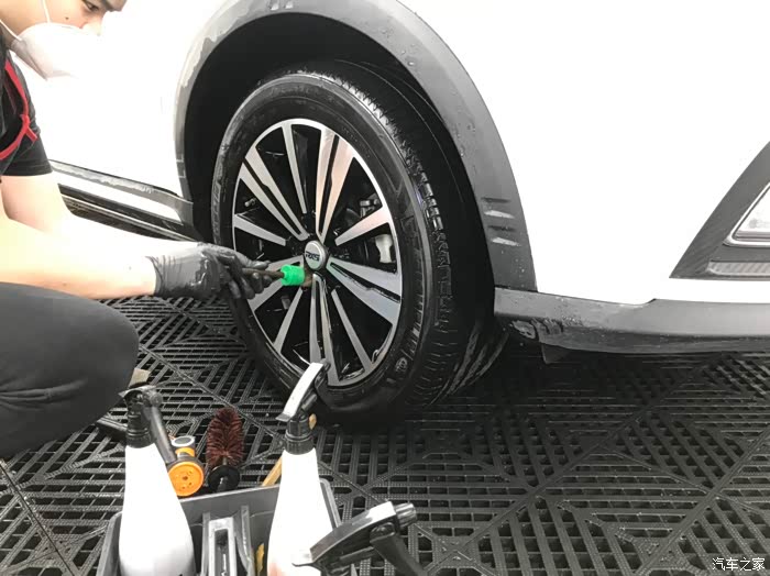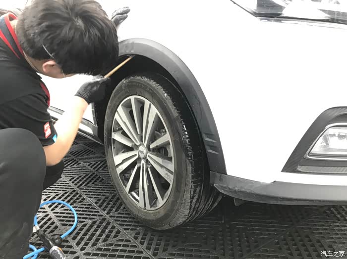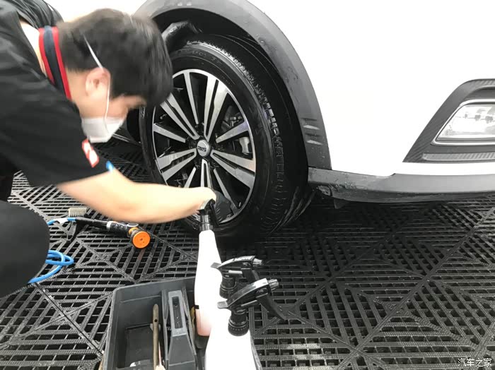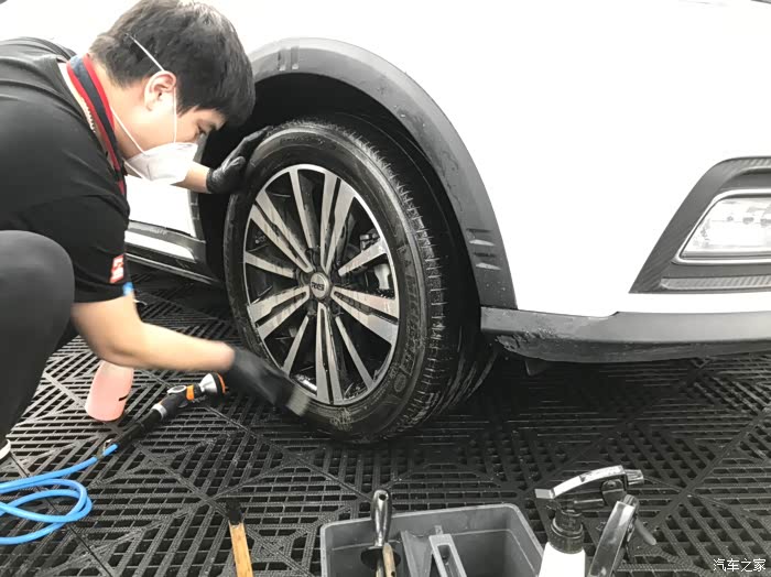 第二步洗刷轮毂胎壁以及去铁粉,在细节刷的同时也有另外一个伙伴在很认真的细刷脚垫!