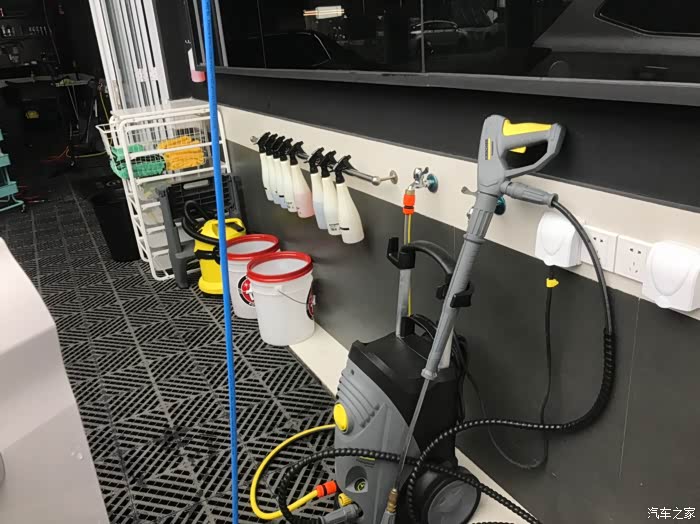 墙壁上挂着各种洗车用的喷壶,高压水枪,俩筒,吸尘器!