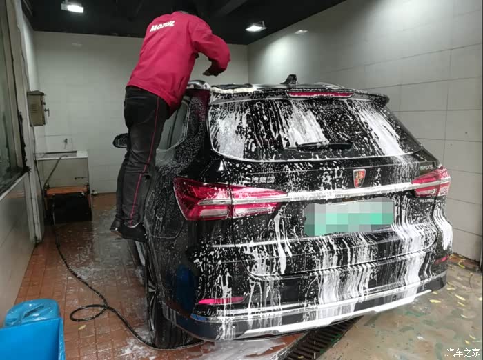 工作人员开始拿喷头对着老大冲洗车身,看着白色的泡沫一点一点的冲掉,强迫症的福音。