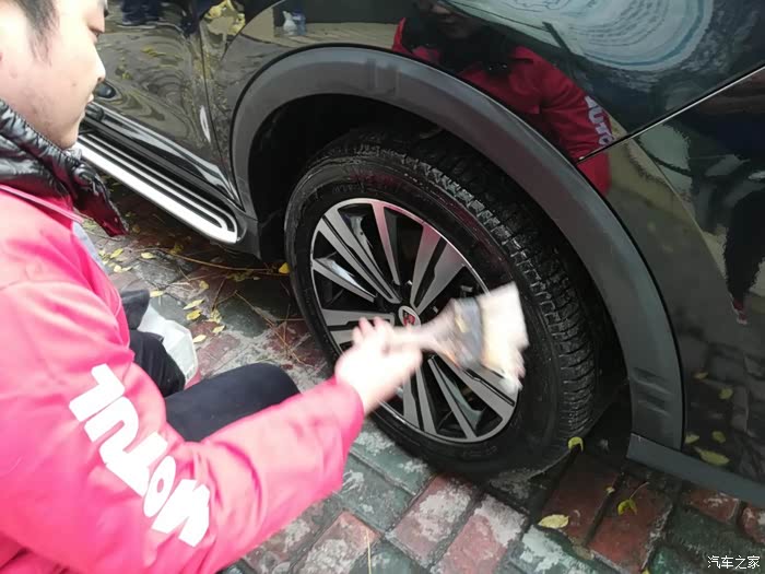 最后一步了,洗车员工开始为老大抹上轮胎蜡可以防止轮胎开裂,最主要是美观。