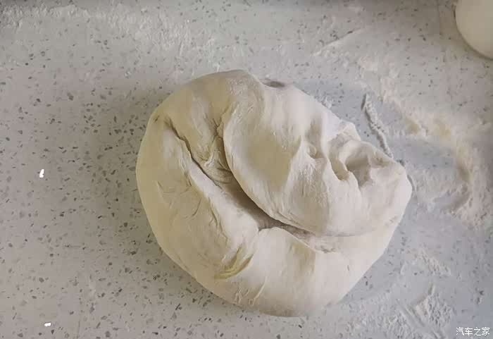 在台面上撒一层干面粉,然后把面团拿出来继续揉。