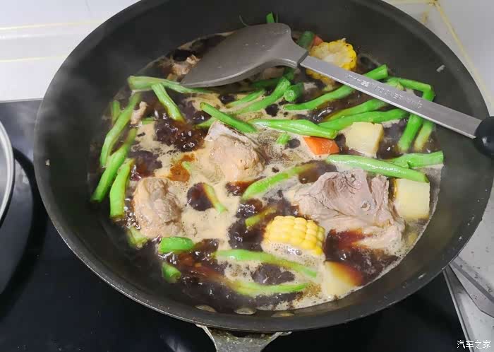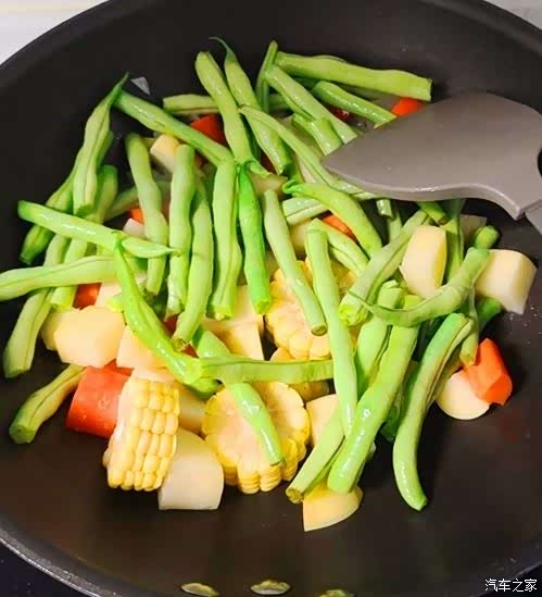 把切好的架豆王,土豆,胡萝卜和玉米段倒进锅里。不停翻炒。