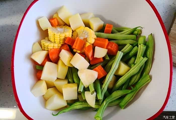 架豆王切段,土豆胡萝卜切小块。玉米棒切厚片,宽粉要先用水泡着备用。