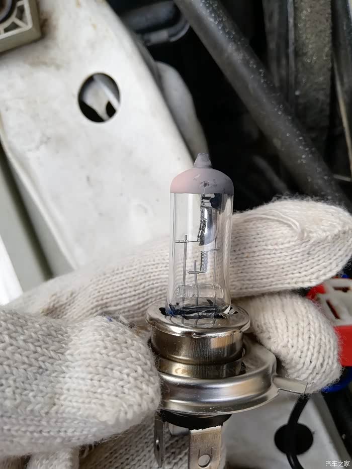 没发现灯丝断开,但是灯泡头部明显烧糊了~确实坏了