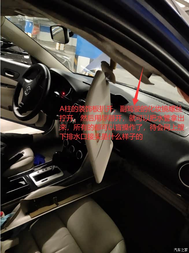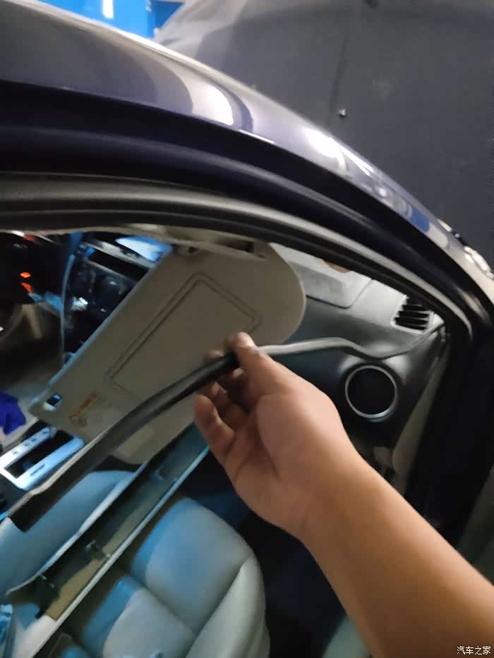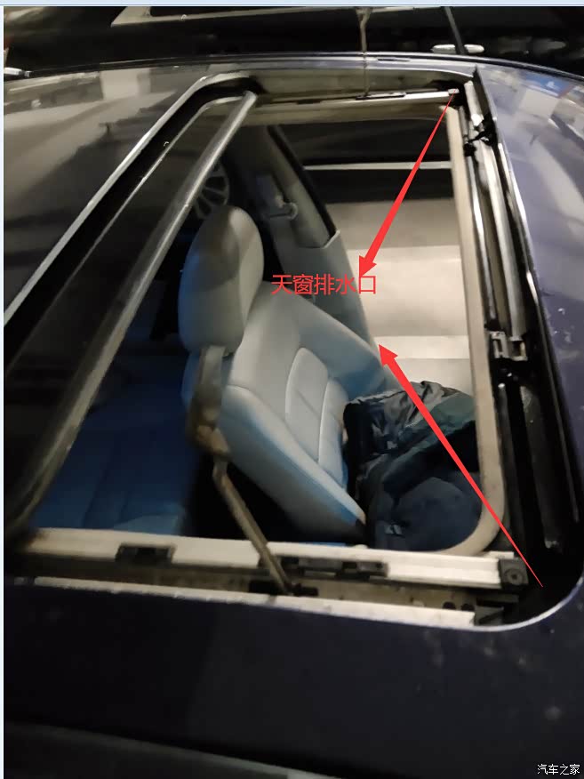 天窗排水口的位置,左右各一个,主驾位置,我用吸管插入,倒点水,用湿纸堵起来,用了吃奶的尽,吹通了,但是副驾实在吹不动,只好拆开来解决了。本次只拆副驾驶的教程,主驾已经OK了。