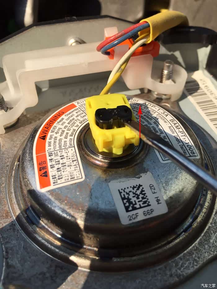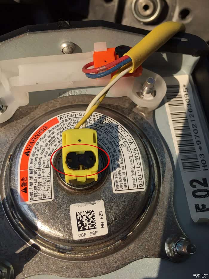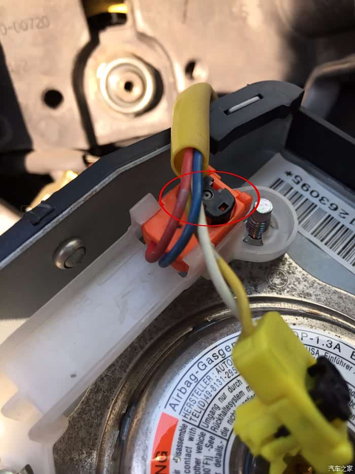 这样气囊就轻松拉出来了 拉出来后有两个插头 黄色和橙色,黄色的是气囊插头,上面都有机关,硬拔是拔不下来的 ,注意看红圈里黑色的东西