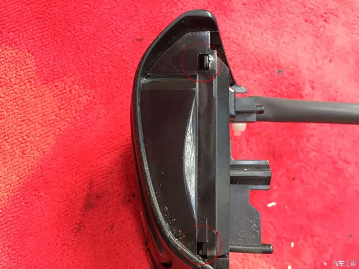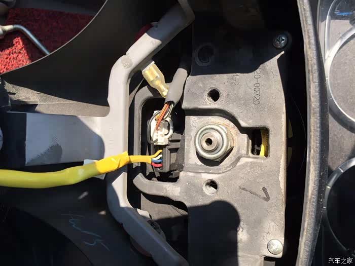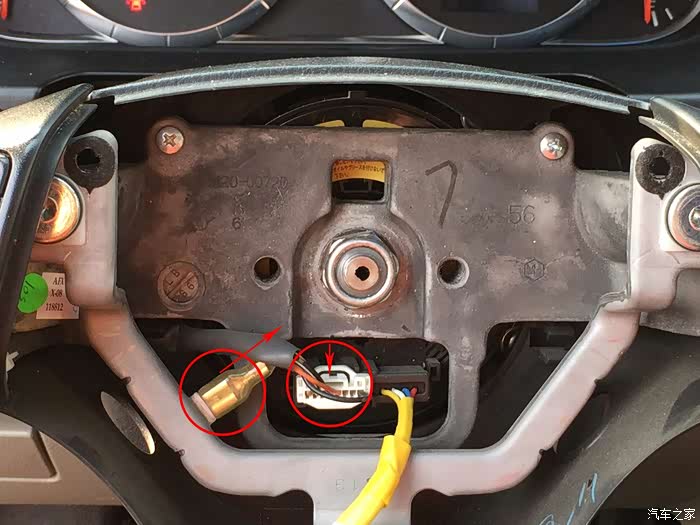 接下来就要拔掉多功能按键的插头了 一共两个 左边红圈搭铁的 一拔就可以,右边红圈内的箭头位置往下按一下就可以拔出来了