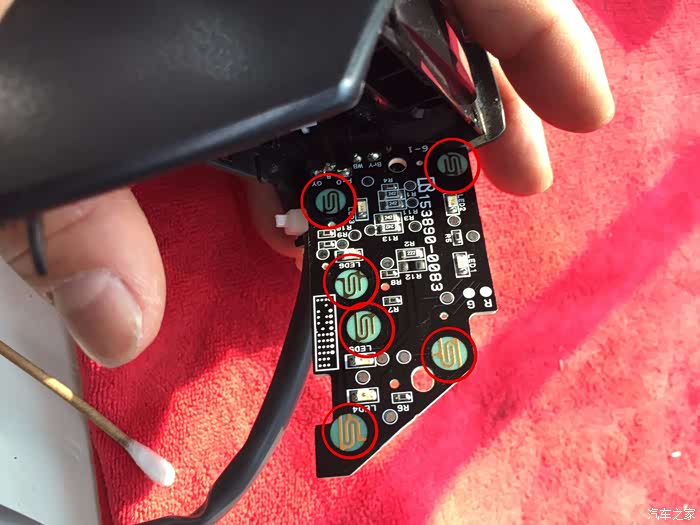 正面 红圈内6个就是按键的金属触点,刚刚打开看的时候 哎呀 白拆了 那么干净怎么会脏呢,不会白拆了吧,不管了 拆都拆了 擦一擦吧,没有酒精也没有橡皮擦 我选择了zippo的煤油,在牙签上倒了一点,来回擦了几下,还有按钮上面那个也有金属触点,忘了拍了 我也一样擦了擦,记得以前家里遥控器不灵敏的时候也是这样擦的,好了 这样就完事了 装回去就可以了