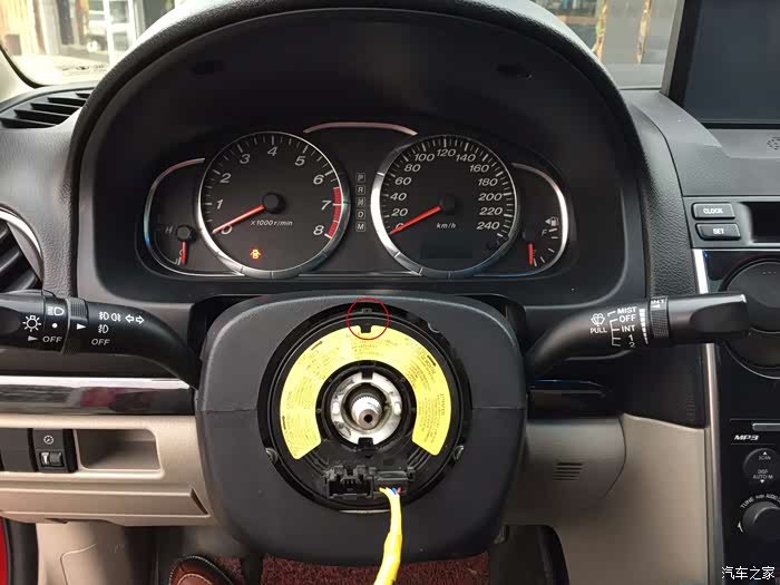 整个方向盘都拿下来了 在你前面的就是游丝,这个就别去动他了,有人说红圈内的三角一定要对齐,可基本方向打正 拆下方向盘后基本就是在这个位置不用动