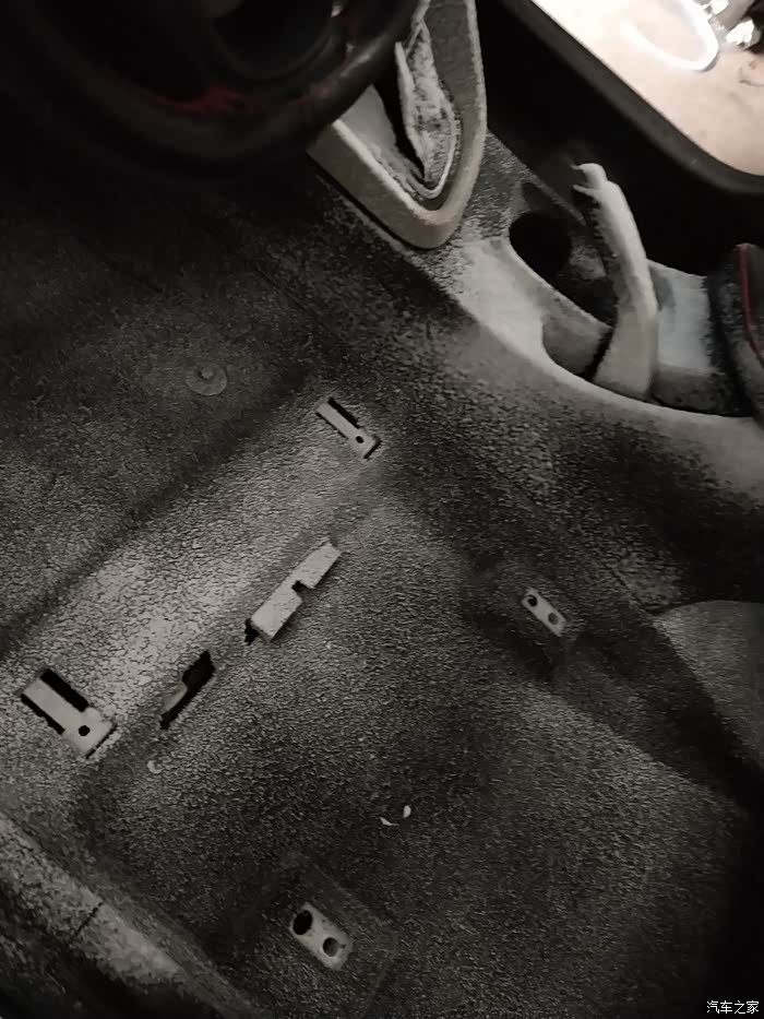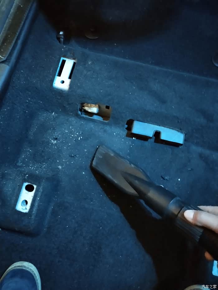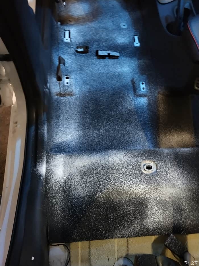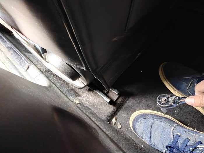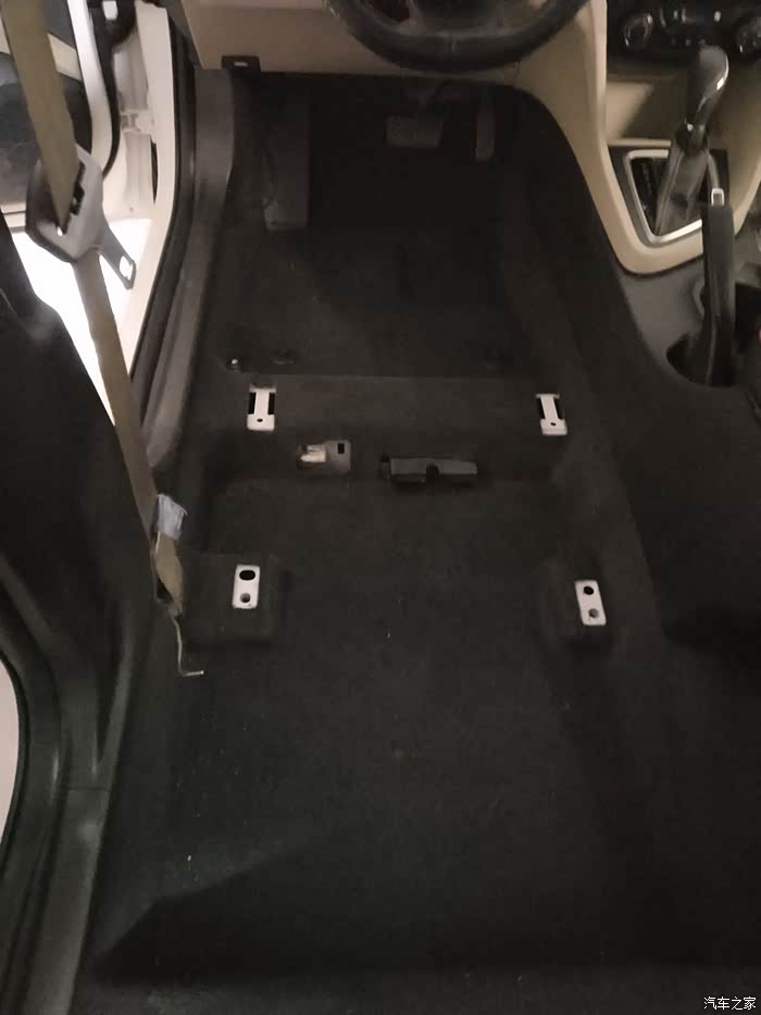 第一步,先把前面俩个座椅先拆了。座椅好拆,划到最前面一边一个内六角还是内八角的螺丝,拆了之后往前一推就好了。主要是安全带,的先把座椅下面的卡壳翘开,然后后面一个十号的螺帽拆了就可以了。