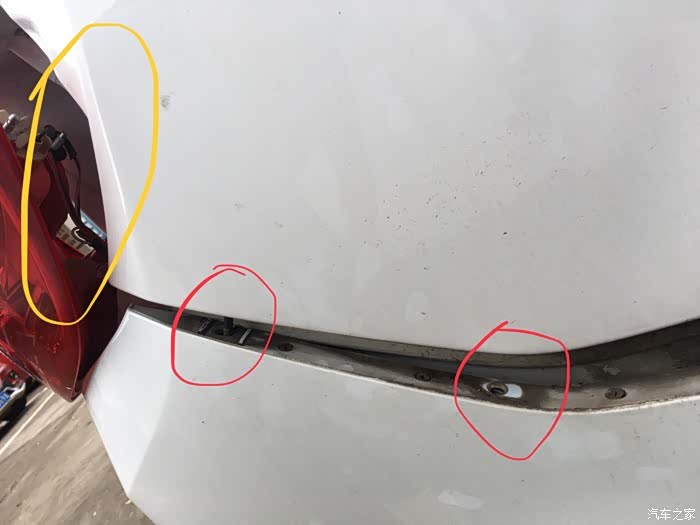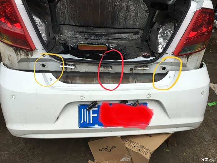 从外面看就是红色圆圈内的位置。由于刚开始拆不下保险杠,不知道哪里还暗藏的有螺丝,所以将后尾灯也拆了下来,防止有按螺丝卡扣后,事实证明,无需拆掉后尾灯。
