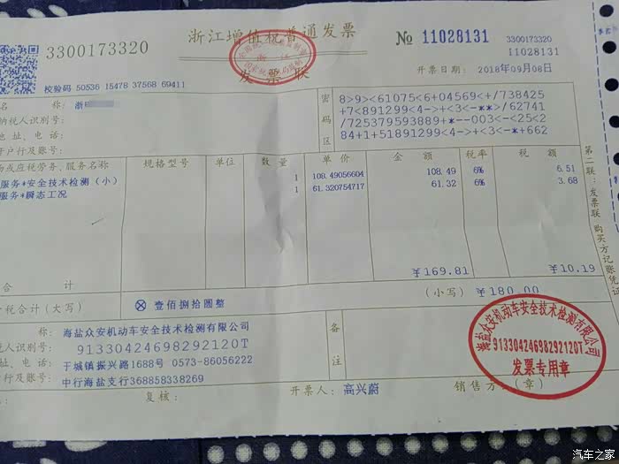 年检收费发票,180元
