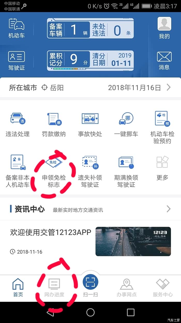 12123在主页面里点伸领免检标识,按它的流程走,填完后点网办进度查询