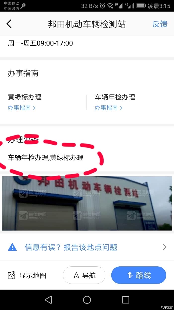 办理好保单就在地图上搜机动车检测站,就搜到最近的邦田检测中心,点进去看见上面有写可以办年检业务。结果跑过去,工作人员说这里不能更换年检标识。但是手机上可以。打开12123,可以网上申请办理。