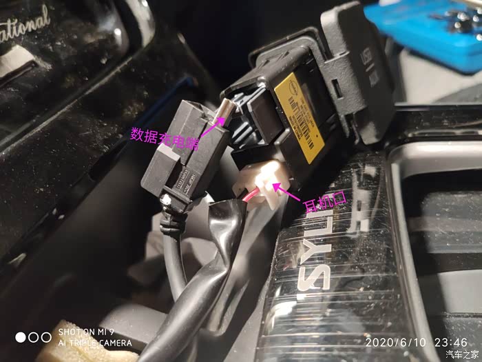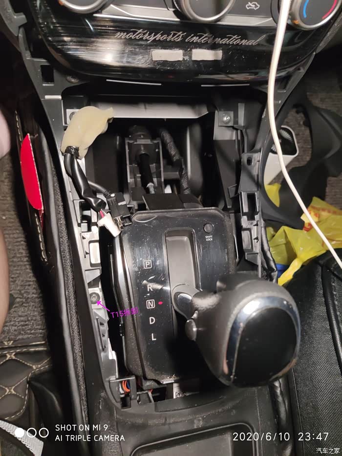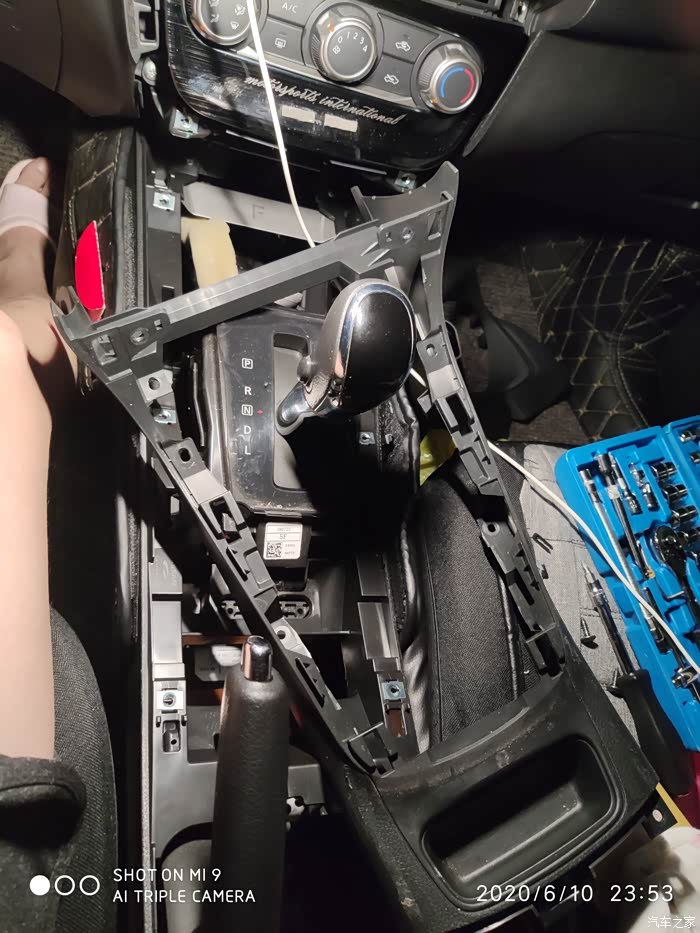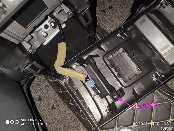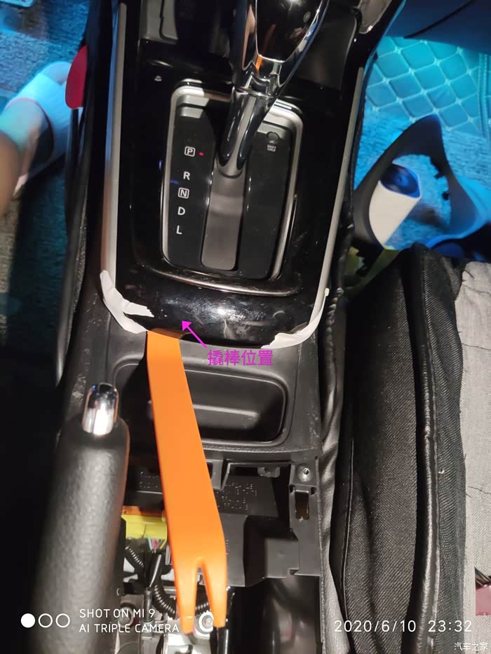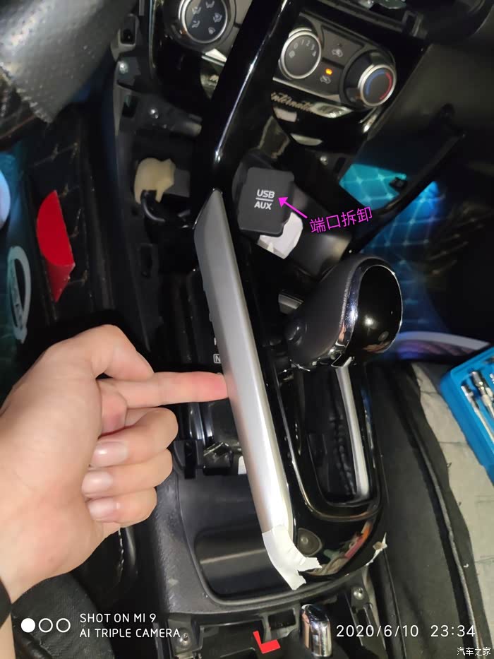 再拆点烟器接头,手按住卡扣,轻轻一拔,图这是大的后盖板无螺丝都是用撬棒,在拆之前先把皮制盖板打开,上面有个小盖板,在最尾端,撬开后在撬这块大盖板