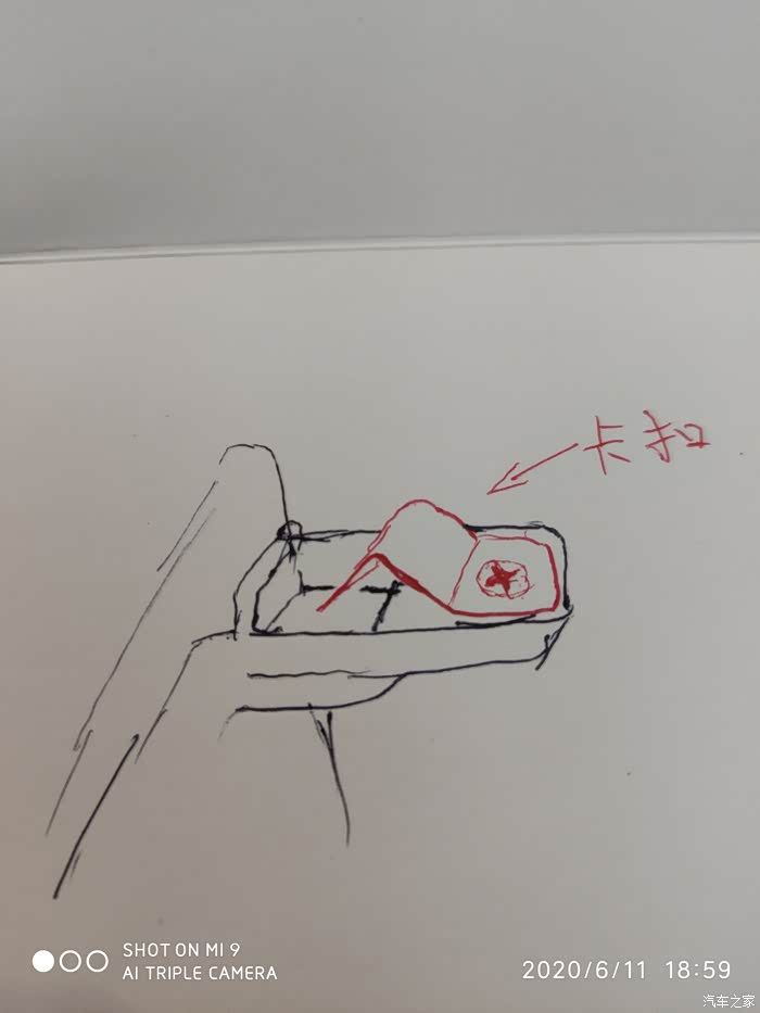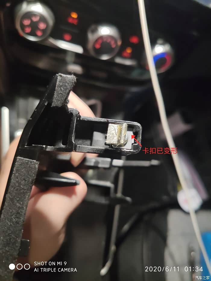 注意,这是中控屏框架拆下来变行的金属卡片,要用尖嘴钳把它夹回原样,如果不夹会原样装上后框架会突出屏幕很多,会松动