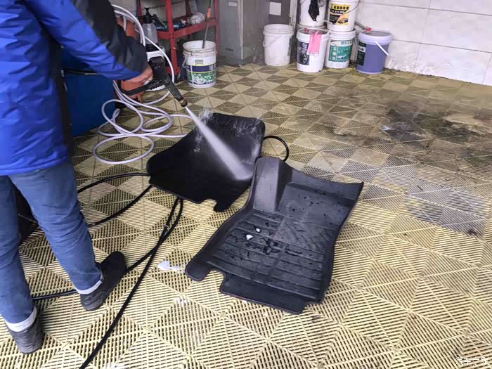 洗干净了车身就要清洗车内的了,第一步先将脚垫刷洗干净、放入一边控干。