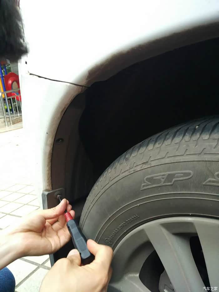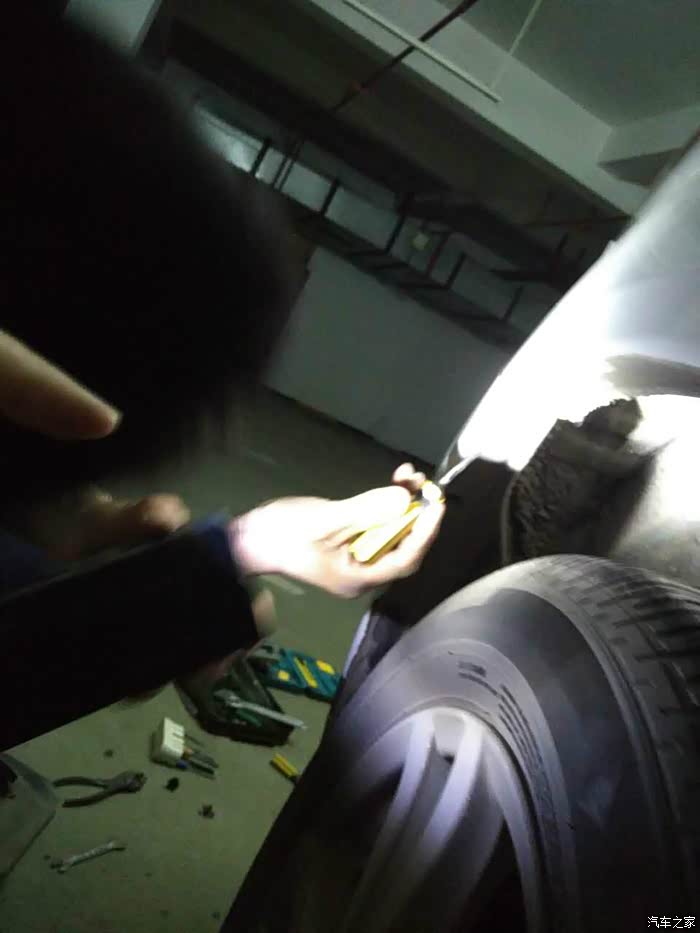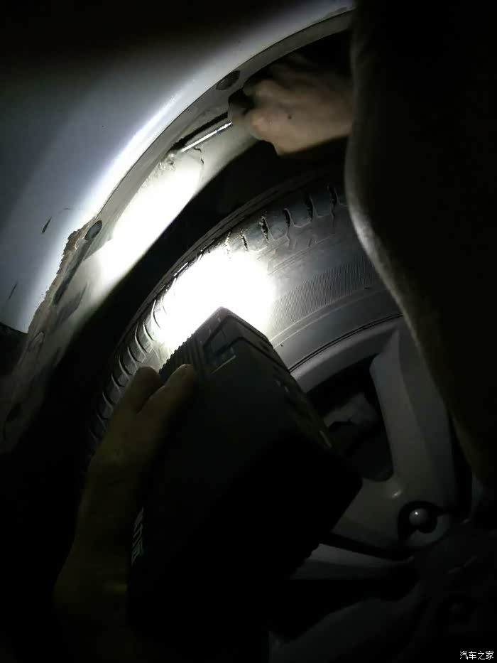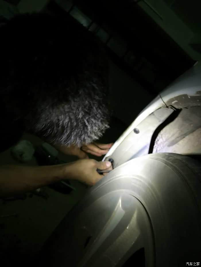 首先拆右挡泥板吧,可开始没多久,天公不做美,下起大雨来了,于是赶紧将车挪回了地下车库。。。。。。