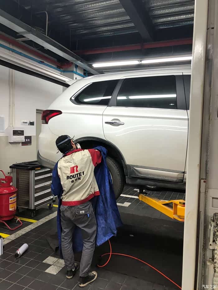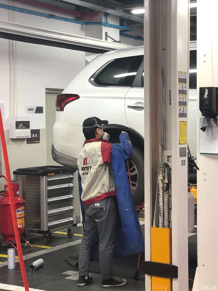 师傅开始施工了,底盘喷两瓶,手法非常熟悉.几分钟就喷完第一瓶了.这个味道非常的大,当时我还带着口罩的.还是闻到很大的味道....这个工作也是非常辛苦的.....