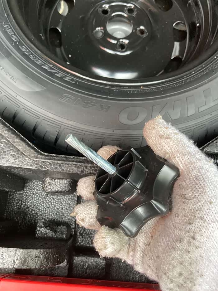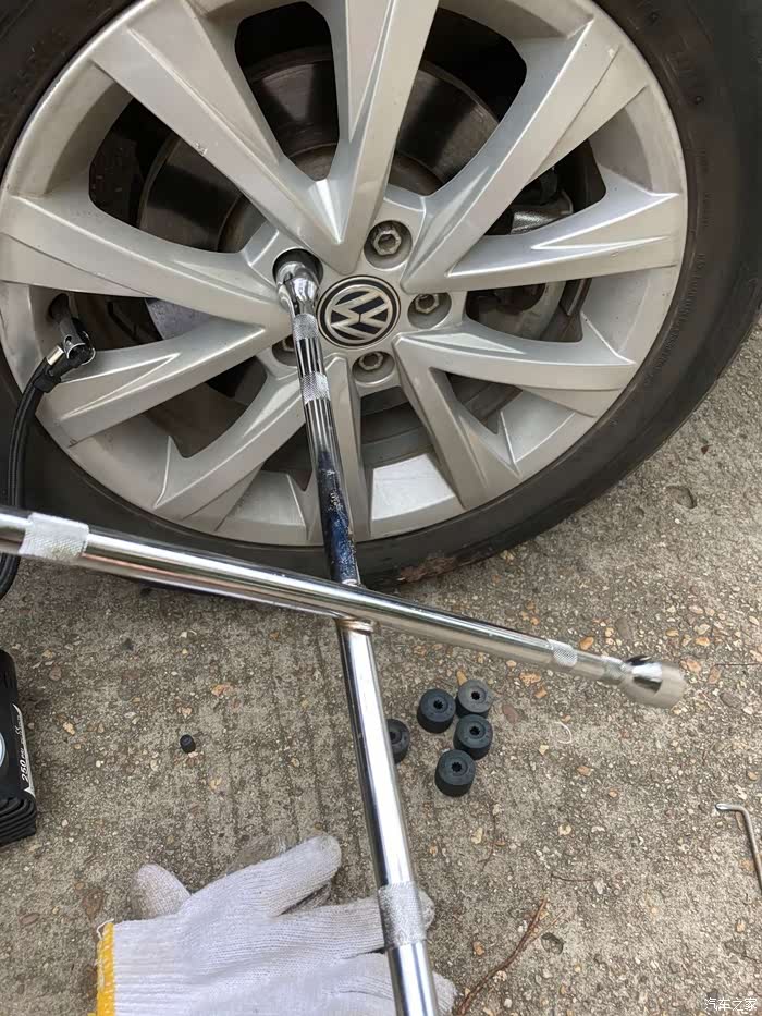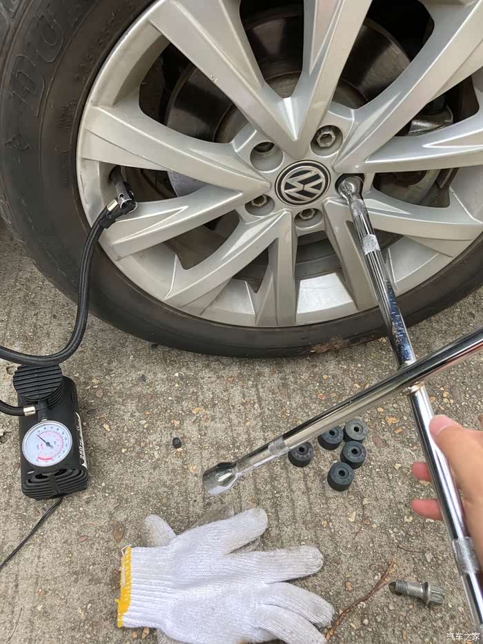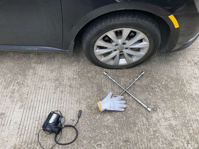 赶紧把工具拿出来呗,车载充气泵,手套,十字扳手,别问我为什么会有手套和十字扳手这种不常见的东西,毕竟轮胎店才会有十字扳手这种大扳手,手套,那是单位车上用来搬货的时候用的,至于大扳手,也是单位车上的。