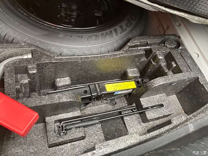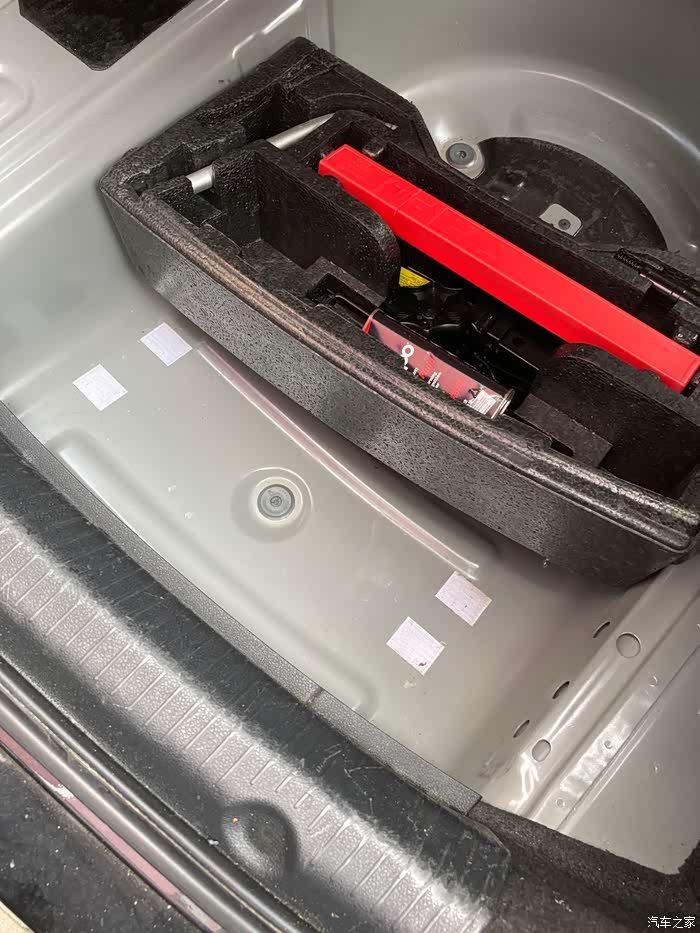 除了这些工具,还要有千斤顶,打开后备箱,(忽略一下乱七八糟的后备箱)把东西都搬出来,拉起并取出后备箱的底垫,备胎和千斤顶等工具呈现在眼前,