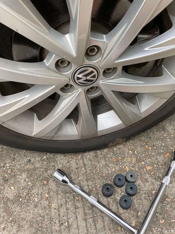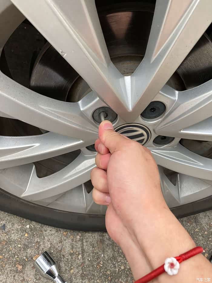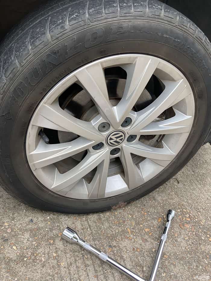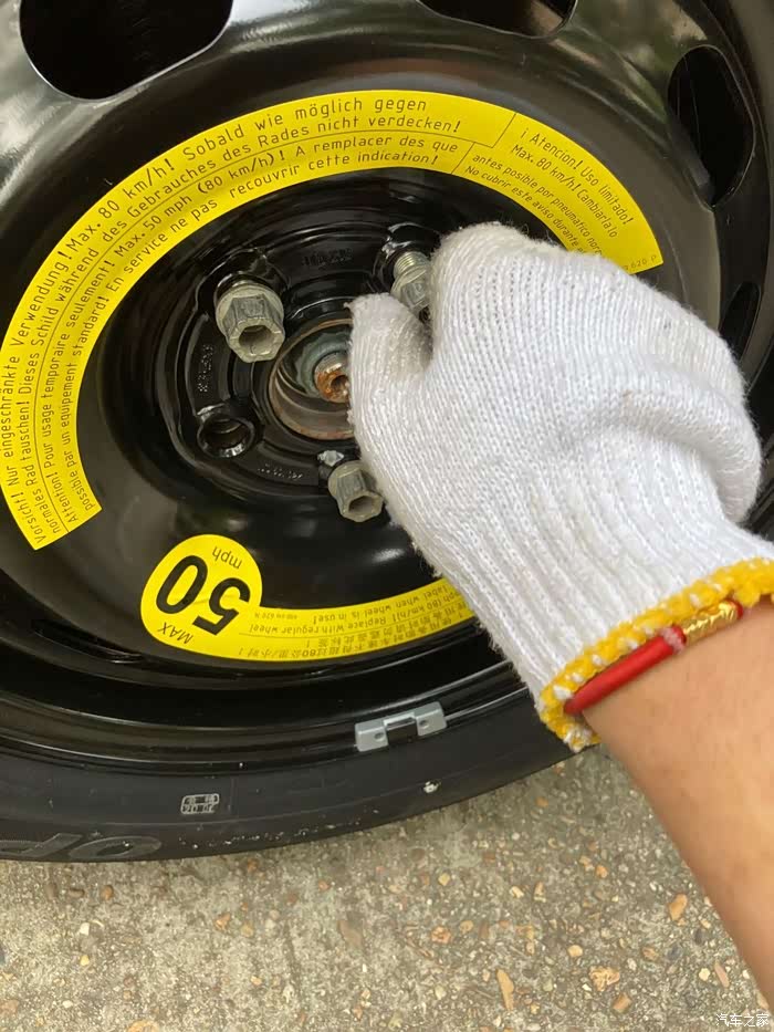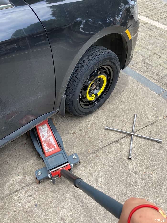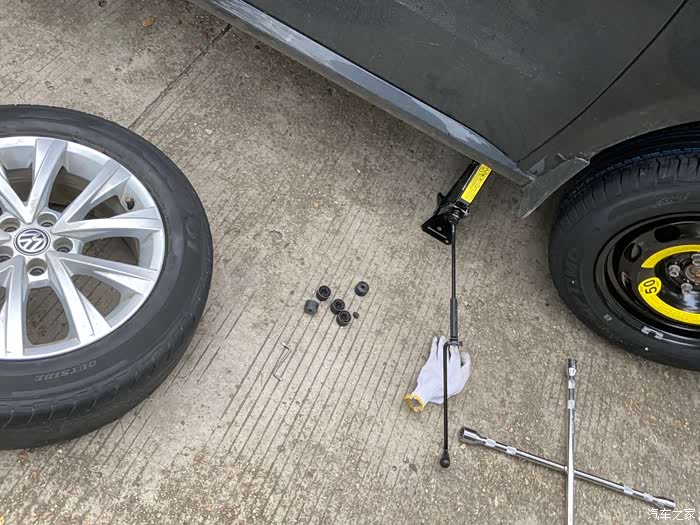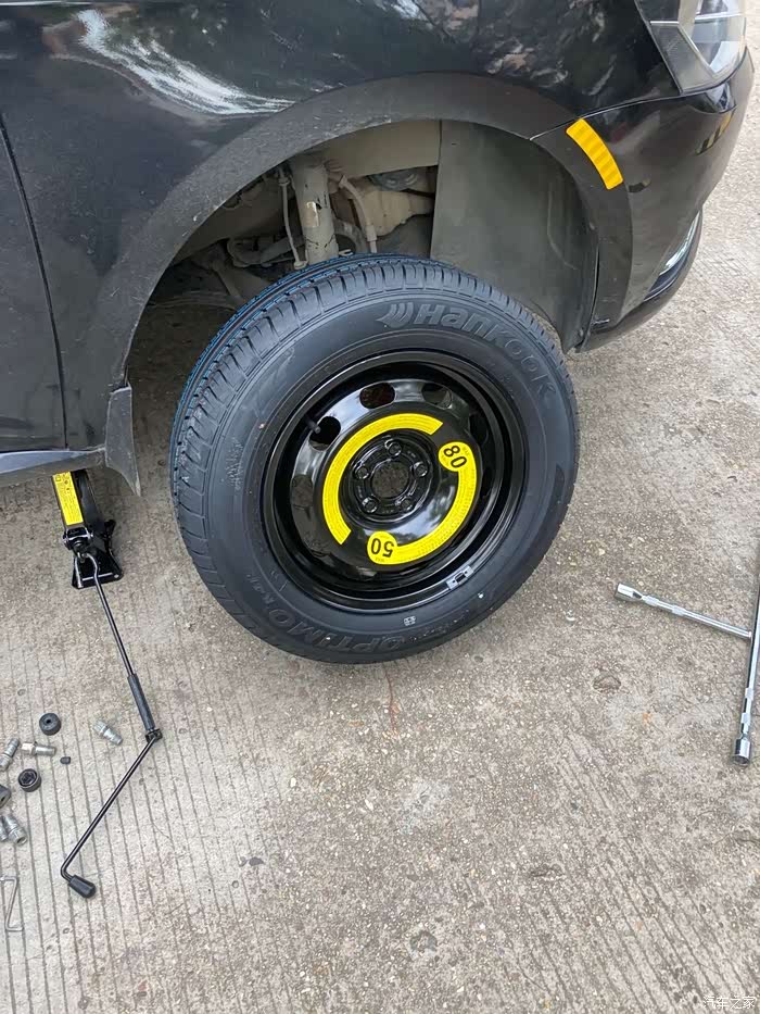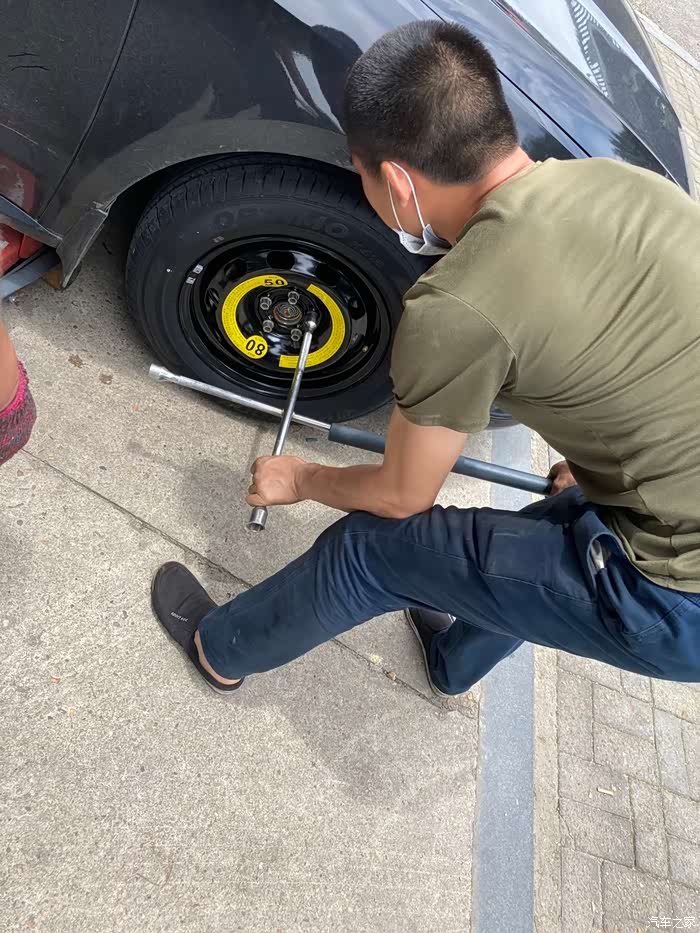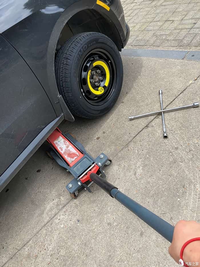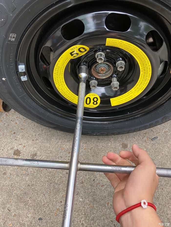 在备胎落地以后,再一次用十字扳手拧紧螺丝,这一次拧紧螺丝我同样使出了吃奶的劲,哈哈哈哈
