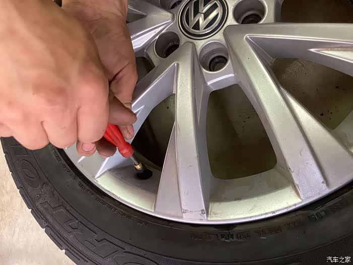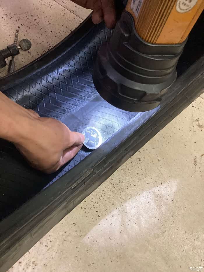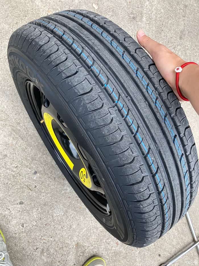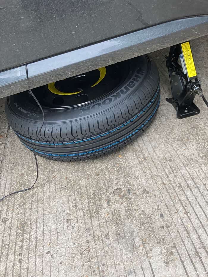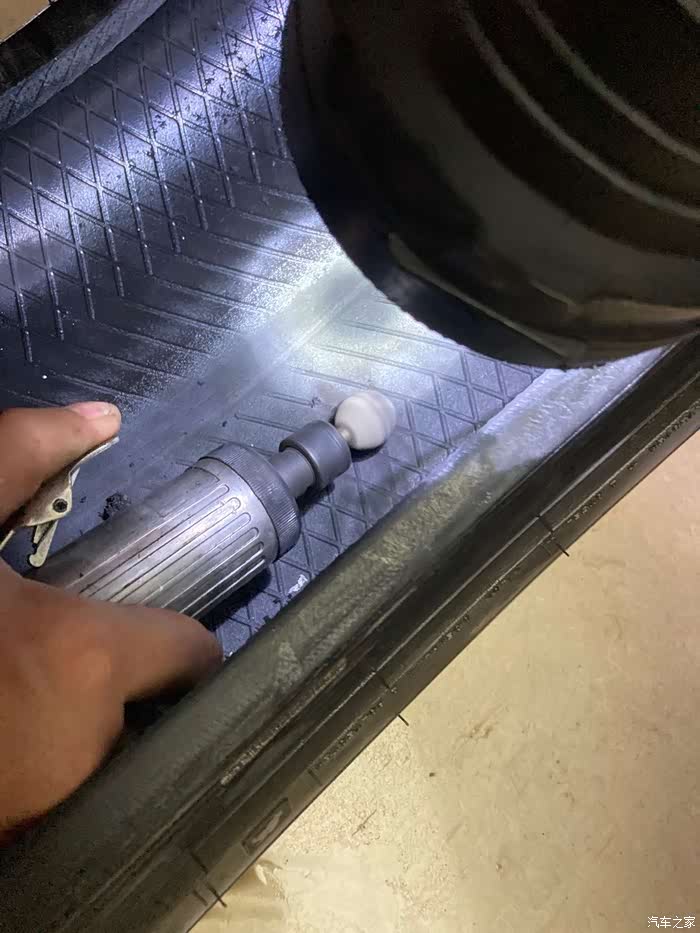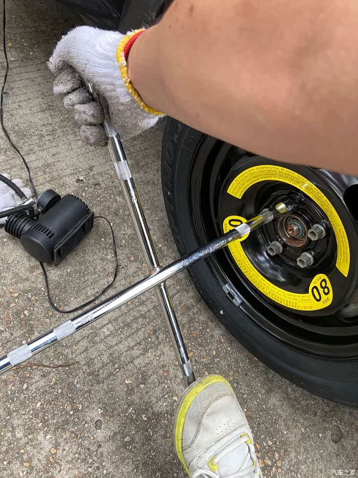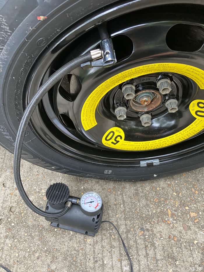 因为这是第一次备胎转正,加上之前从未对备胎有过检察,所以备胎有些缺气,就用车载打气泵给备胎充气