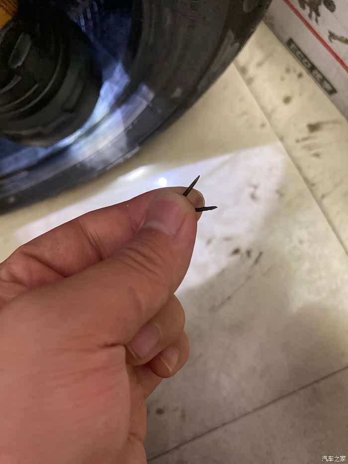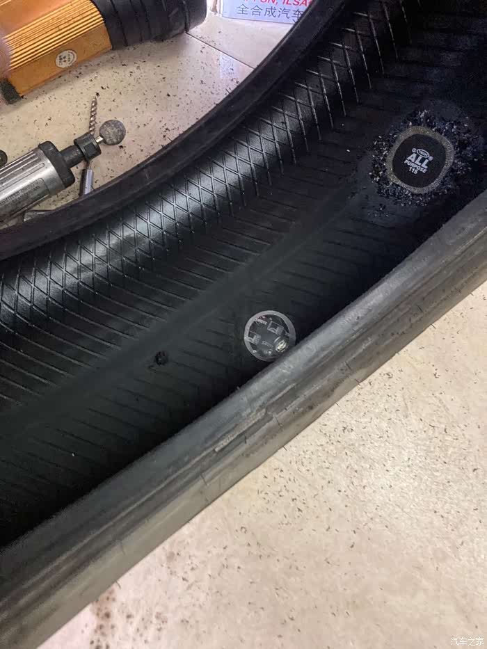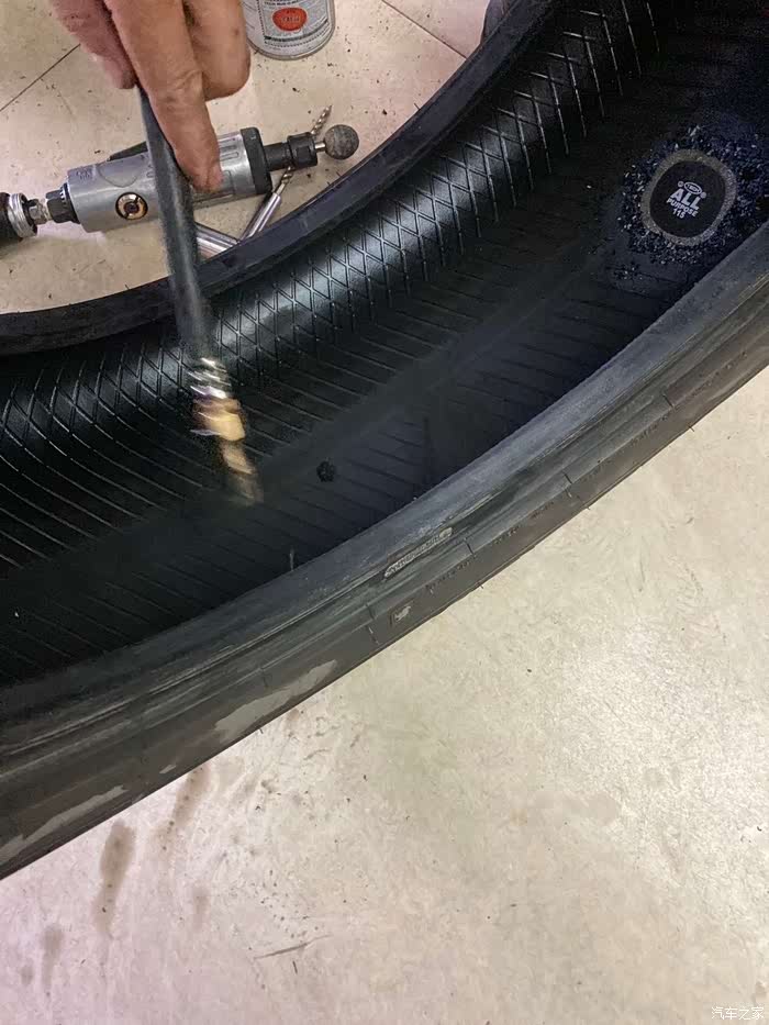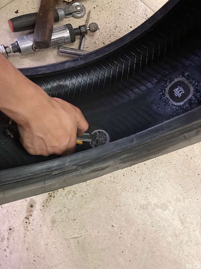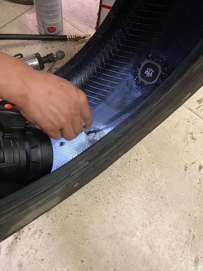 好,开始补胎的过程,因为之前已经找了漏点并且标记了,找到了罪魁祸首,取出了两个小钉子,