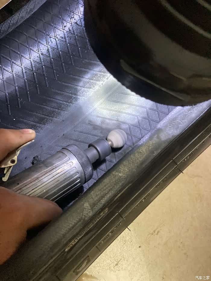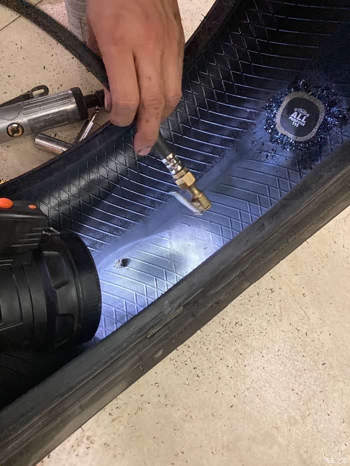 因为打磨以后有橡胶屑产生,师傅用吹气工具把橡胶屑吹出