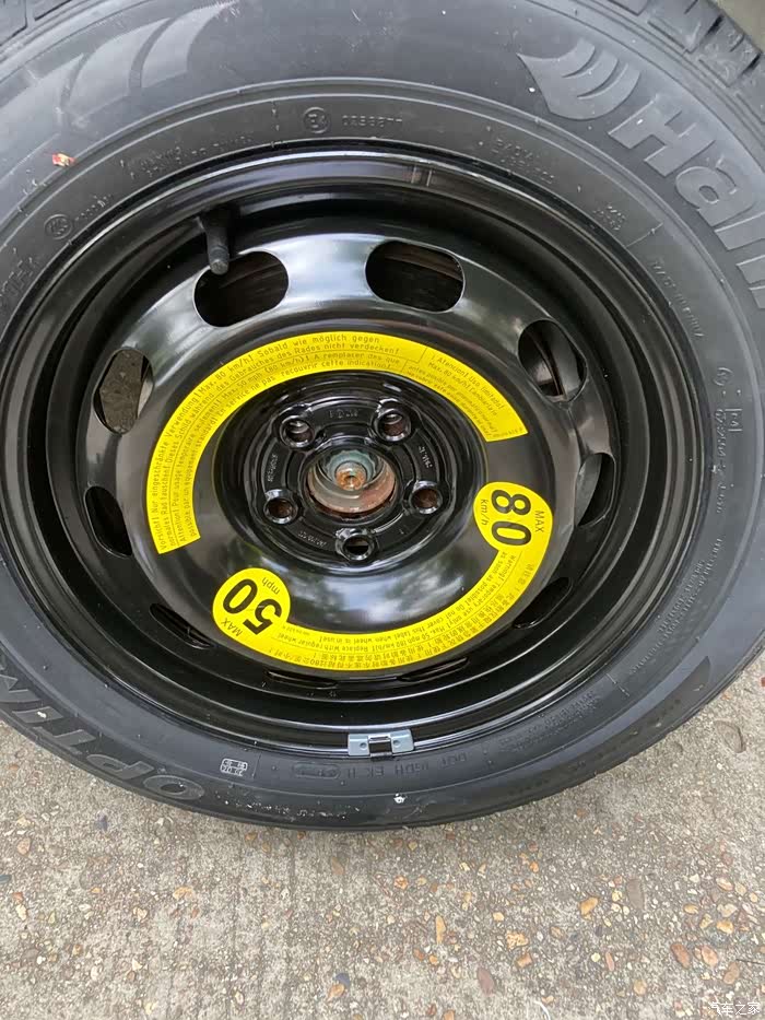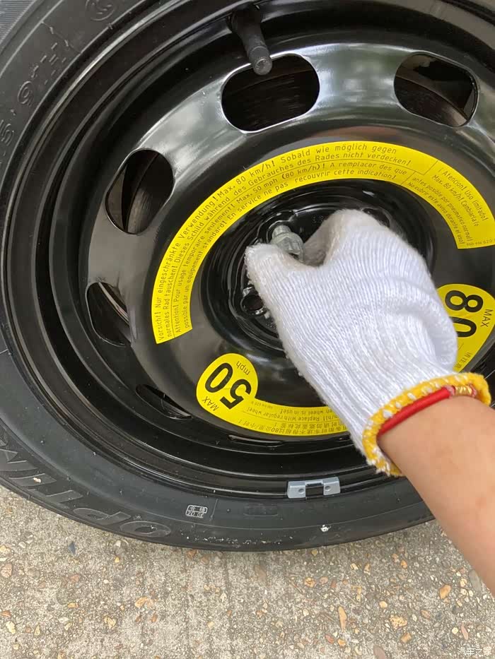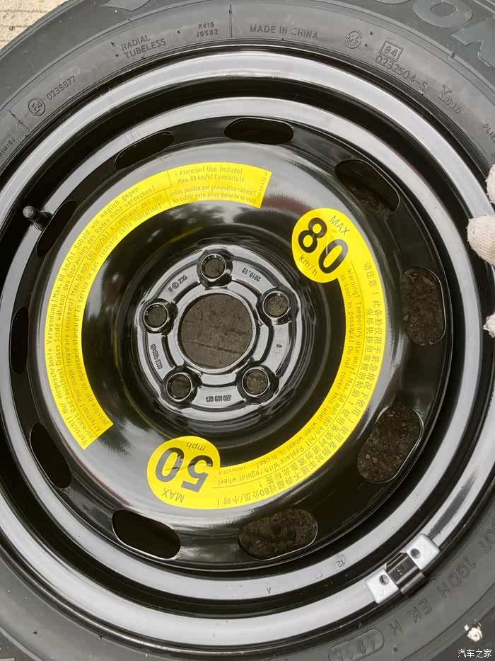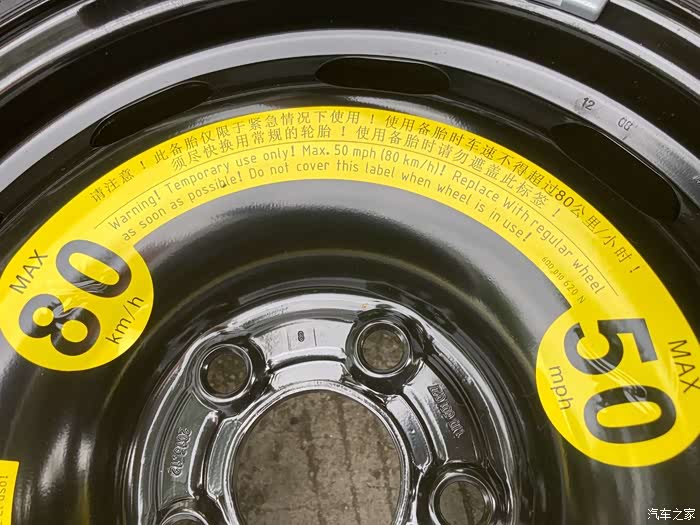 要注意的是,如果备胎在装车使用中,不能超过80KM/H的时速,在铁质轮毂上明显位置也贴有提示