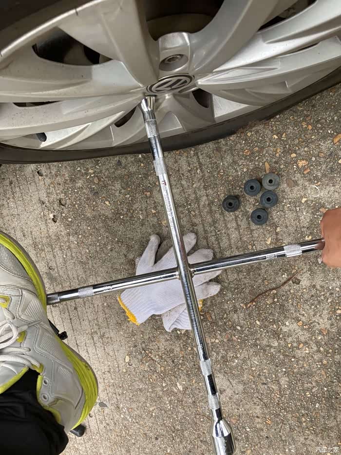抄起十字扳手准备拆螺丝,大家要注意一个问题,拆装螺丝要注意错位拆卸及安装,即12345孔位顺序需要1→3→5→2→4的孔位顺序(唉呀妈呀,这之前那个挨千刀的装的轮胎,螺丝也太太紧了吧,简直是使出了我吃奶的劲,一要拍照,二来又要拆卸螺丝,只能手脚共用了,)