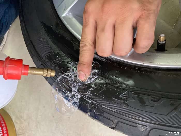 因为胎压异常,还存在漏气的情况,所以师傅继续用喷水的方法寻找漏点,结果,悲剧了,这次找到的漏点在胎壁,得,因为轮胎已经使用了五年行驶了七万公里,加上胎壁上的漏点,所以这条胎已经没有维修价值了,因为没把小黑朗开来,就跟老丈人说调一条轮胎来,过几天有空再来换轮胎,