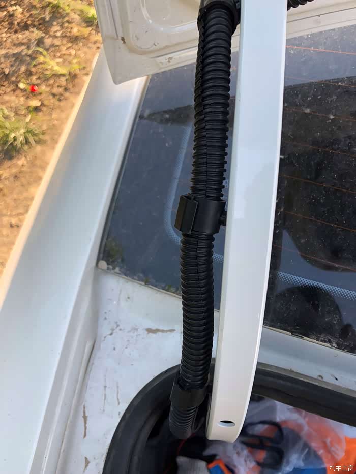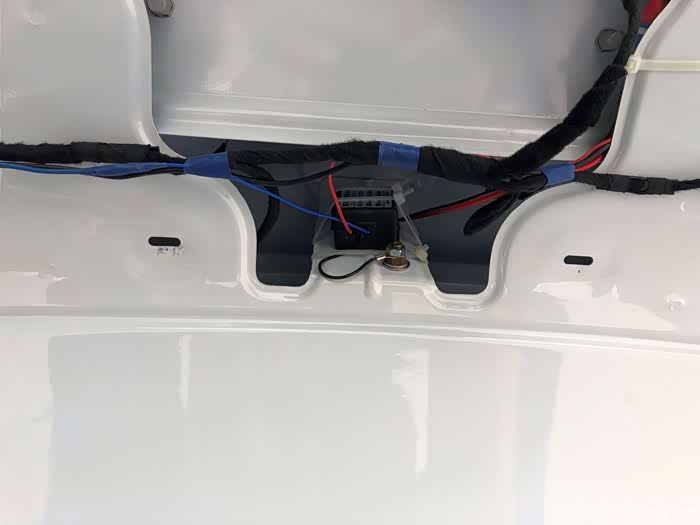 将刹车灯线路和与车机的连接线固定好,这次我决定不在让他裸漏,而是压到了后备箱盖的线路管里并用耐高温胶带和轧带将其固定好.