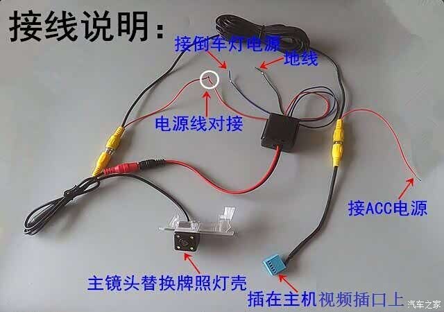 按上图对接各种线路,前面ACC线与电源线连接,地线在后备箱搭铁,倒车灯连接原先的倒车灯线。