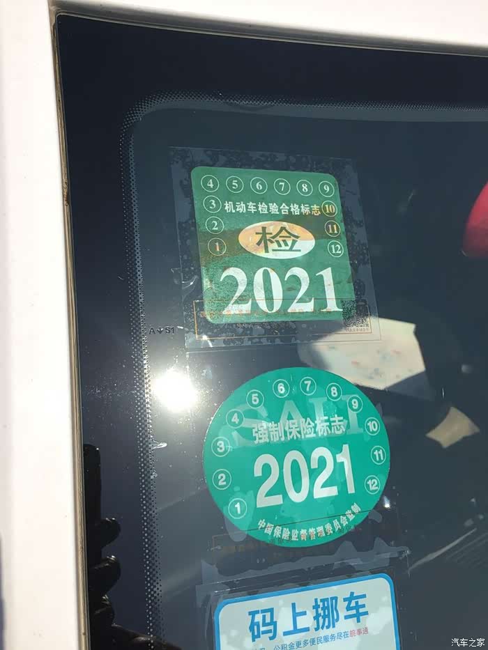 来到车上,静电贴将“年检标志”粘到玻璃上。