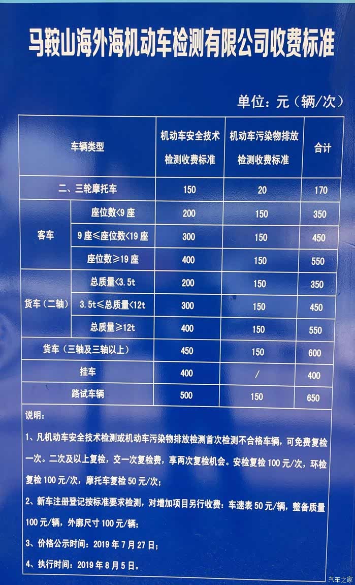 小于9座小客车,检测费用350元。从说明中可以看出,首次检测不合格,可以免费复检一次。