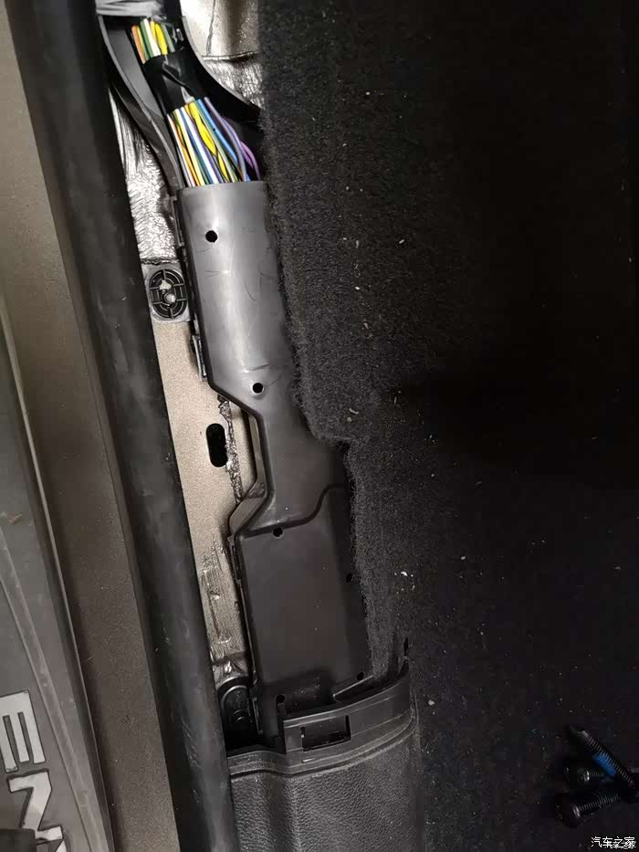 拆开后备箱右边装饰板,可看到后部右侧排水管的布置,排水口在后车轮上部,水从这里排出。