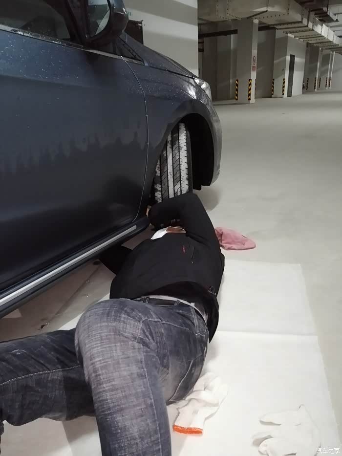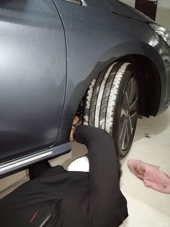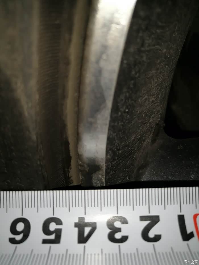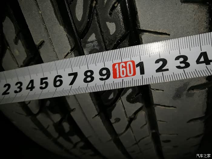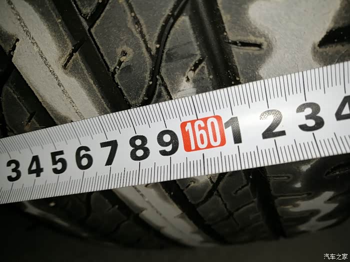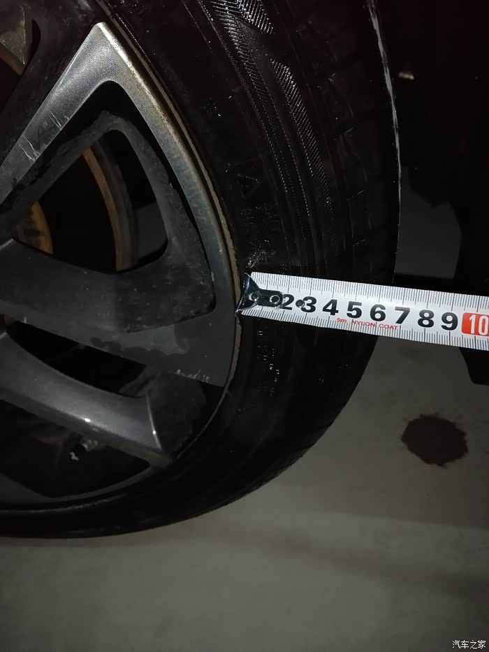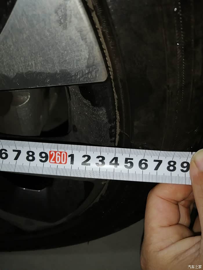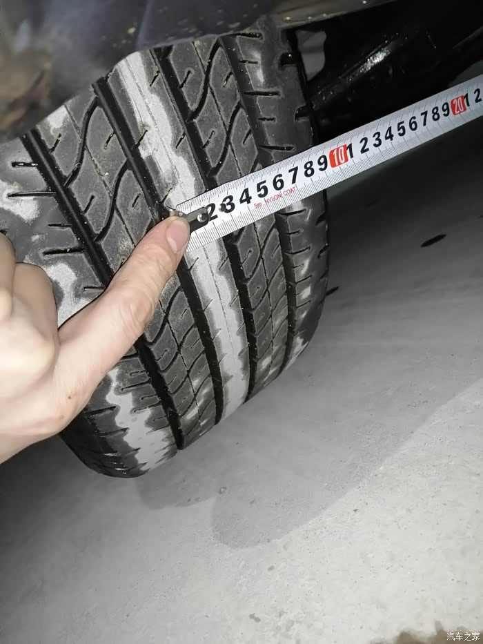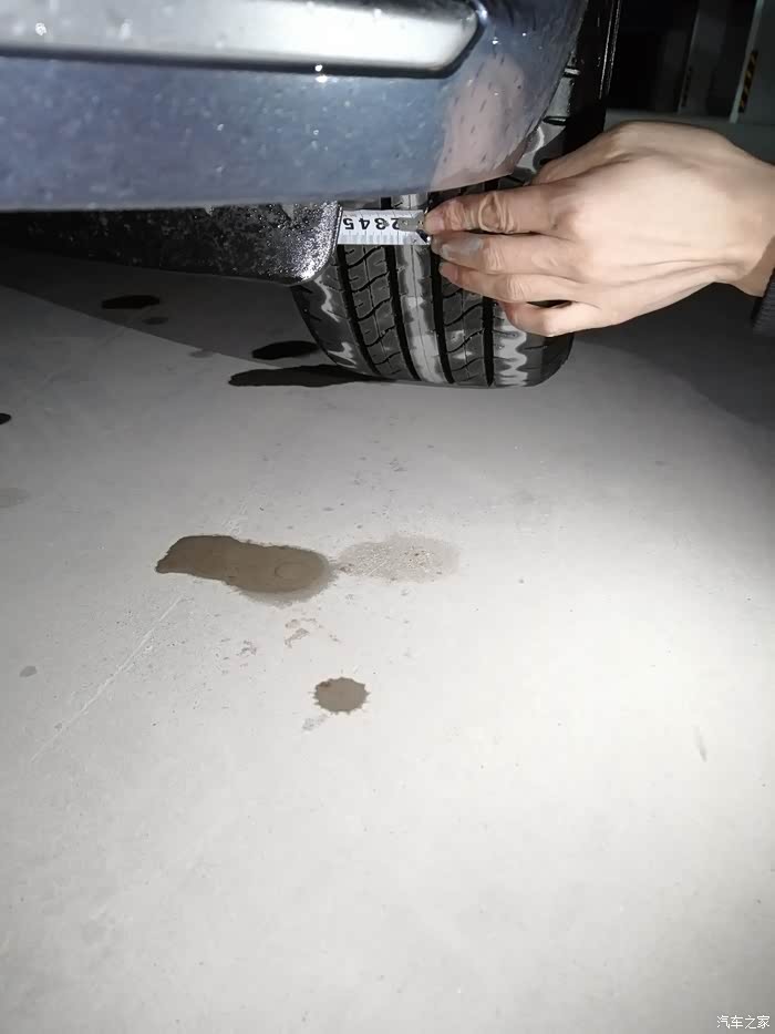 这是前轮后侧测量,测量轮距和轴距一样,找一个同一样的点,找轮胎防滑槽作为测量点,这个测量方法不用怀疑,因为有的四轮定位也是用防滑槽做基准测量几何参数。
