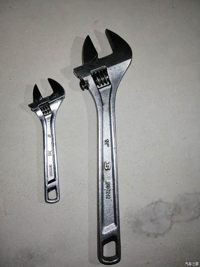 准备了两把博士活动扳手,尽量用开口扳手,开口扳手用20㎜和18㎜。因为活动扳手用不好会把螺母拧滑。到时候会很难搞。为了有空间微调,启动发动机,把方向盘往左打死回一点过来,然后发动机熄火。因为这样右轮才有工作空间。