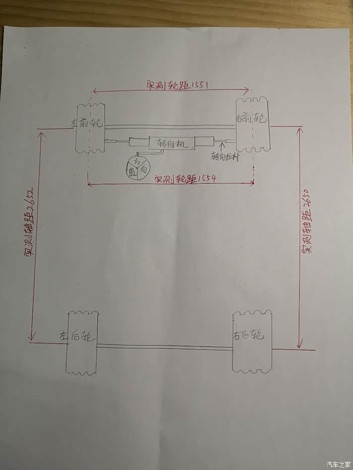 左侧轴距实测2653,按照这个数据应该往右跑偏,左侧大于右侧3㎜,车子会往轴距短的一侧跑,先不着急下定论。继续测量前轮距,