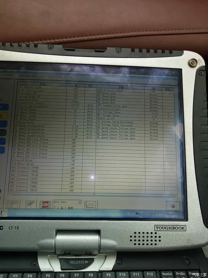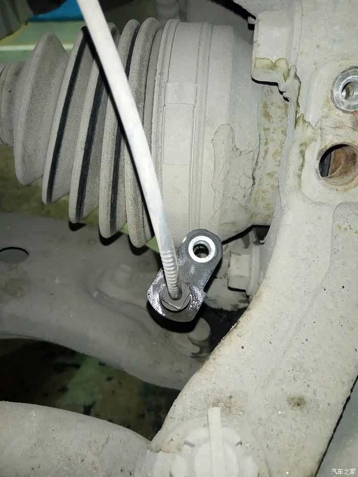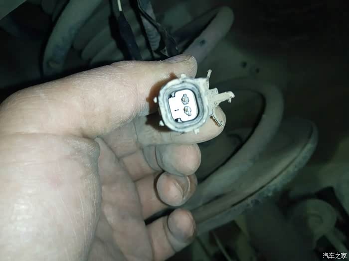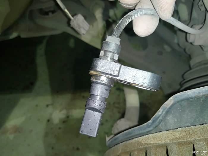 使用电脑读取故障码,储存故障码为:C1405右前轮转速传感器电路存在短路或断路,P1750制动ECU故障。p1750为并发症,主要故障在于C1405右前轮转速传感器电路存在短路或断路。首先确认该故障码点亮条件:1.转速传感器信号电路断路持续0.5秒或更长时间,2.传感器电压持续下降0.5秒或更长时间。首先怀疑传感器电路断路,拆卸右前轮胎及右前轮内衬板使用螺丝刀撬开插头,启动发动机检查电压12.4V正常,熄灭发动机电压0V正常,来回晃动线束检查有无虚接,无虚接现象,检查线路有无断裂现象,确认在插头根部有压痕但是没有断裂,重新使用胶带粘接。试车故障依旧。检查传感器电阻并与左侧进行对比,电阻一致,传感器正常。检查传感器发现其顶端较脏,清洁传感器试车故障依旧,使用电脑读取右侧车轮车轮转速明显低于其他车轮,有时无车速输出。重新拆卸车轮检查发现右侧车轮轴承内部杂质较多,且有水渍,传感器接触轴承产生信号,使用清洗剂清洗轴承及传感器后试车,故障灯消失,左右车速一致,经过平整路面测试与颠簸路面测试,车速在10迈至130迈之间测试,确认车速一致,刹车正常,且不会再次复发,至此故障确认为:右前轮轴承内部锈蚀造成传感器脏污,从而引发传感器短时间接受不到车速信号引起故障灯点亮。
