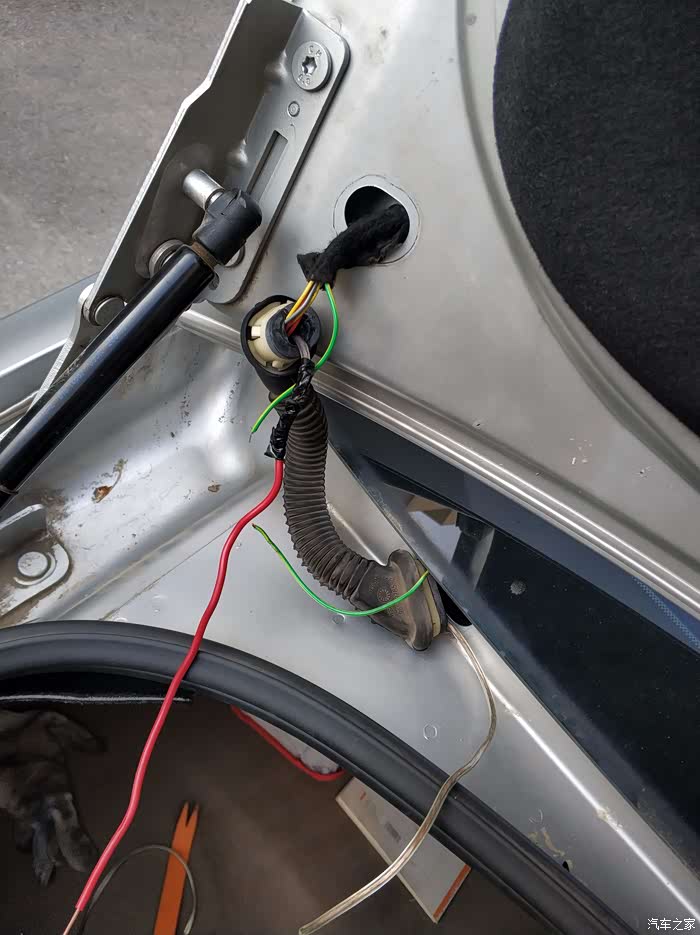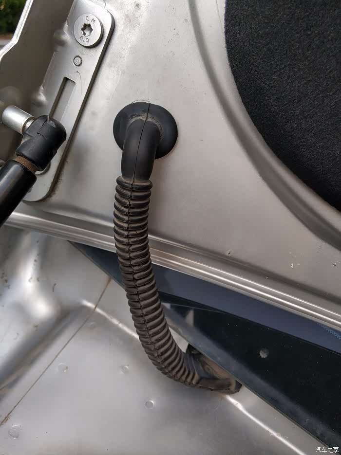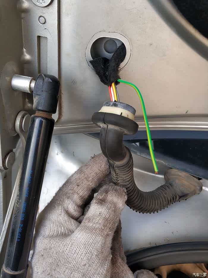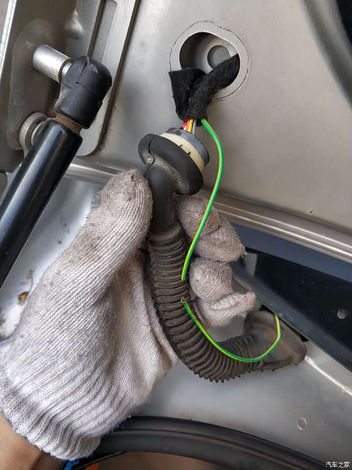 把后备箱盖上的这个卡子拔出来,每根线拨动了一下,就发现这根黄绿相间的线松动了,轻轻一拽,就出来了。果然断了