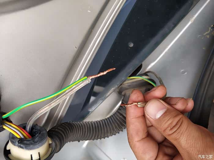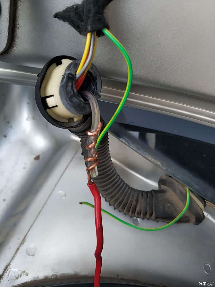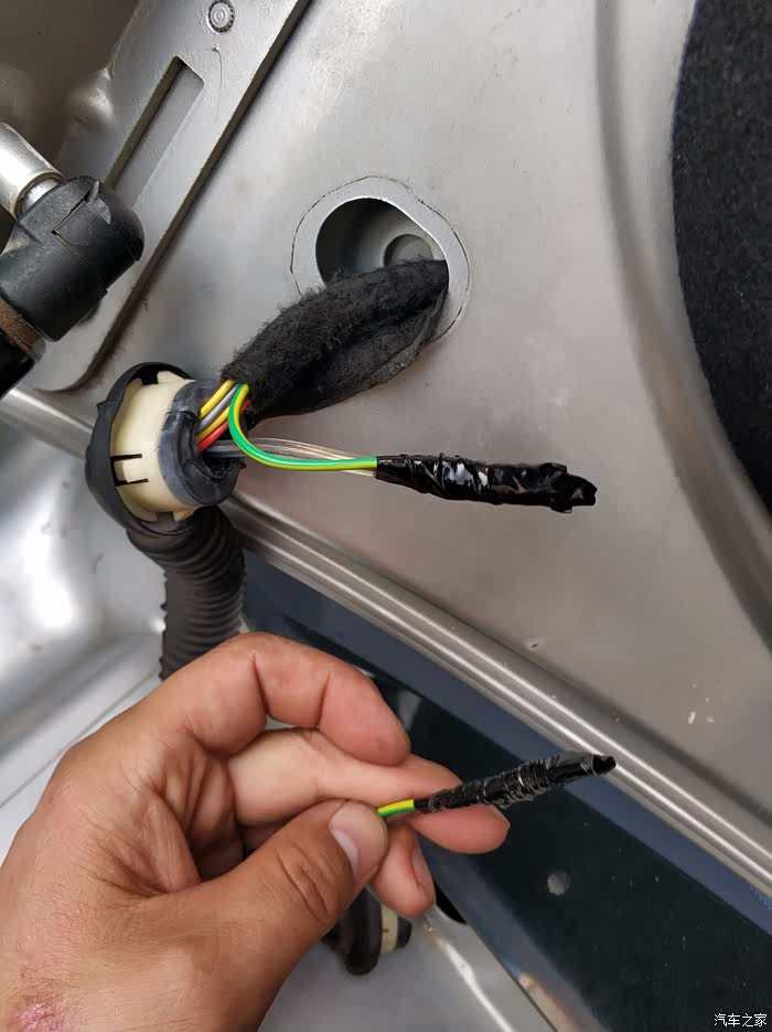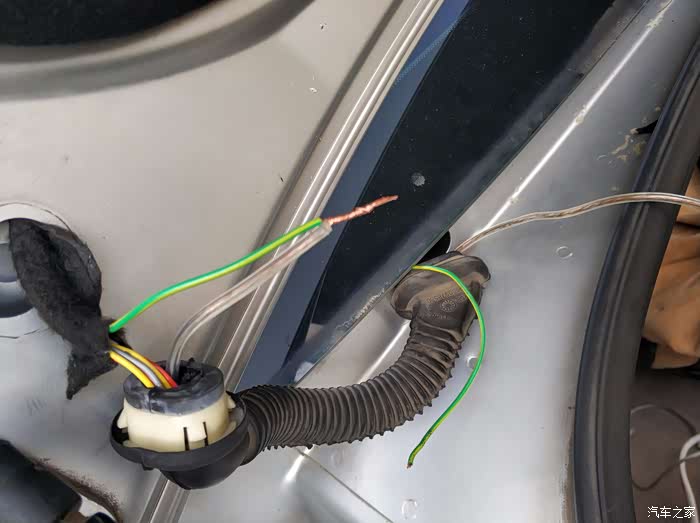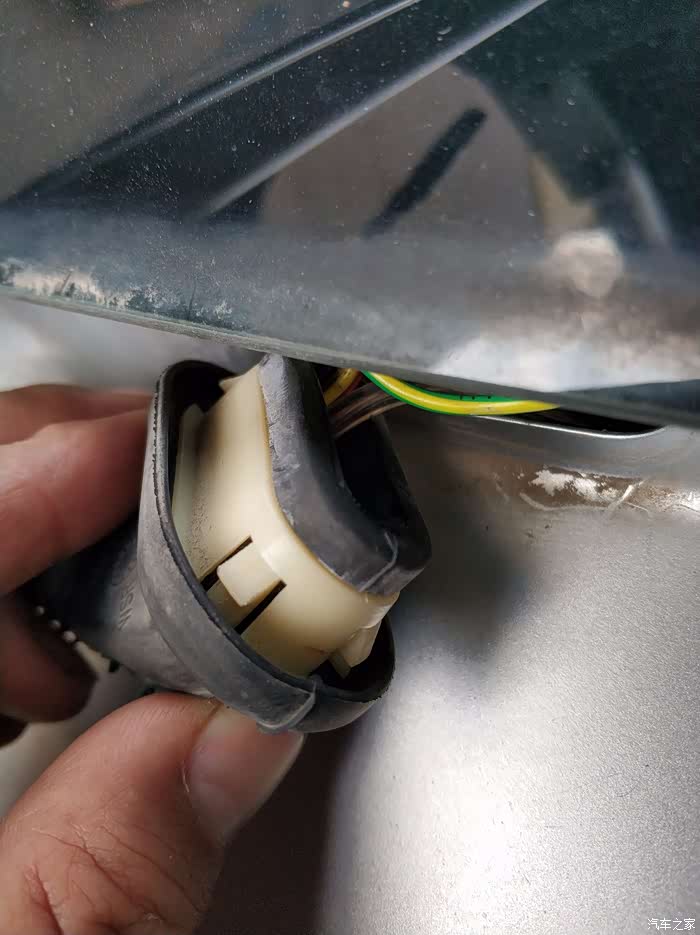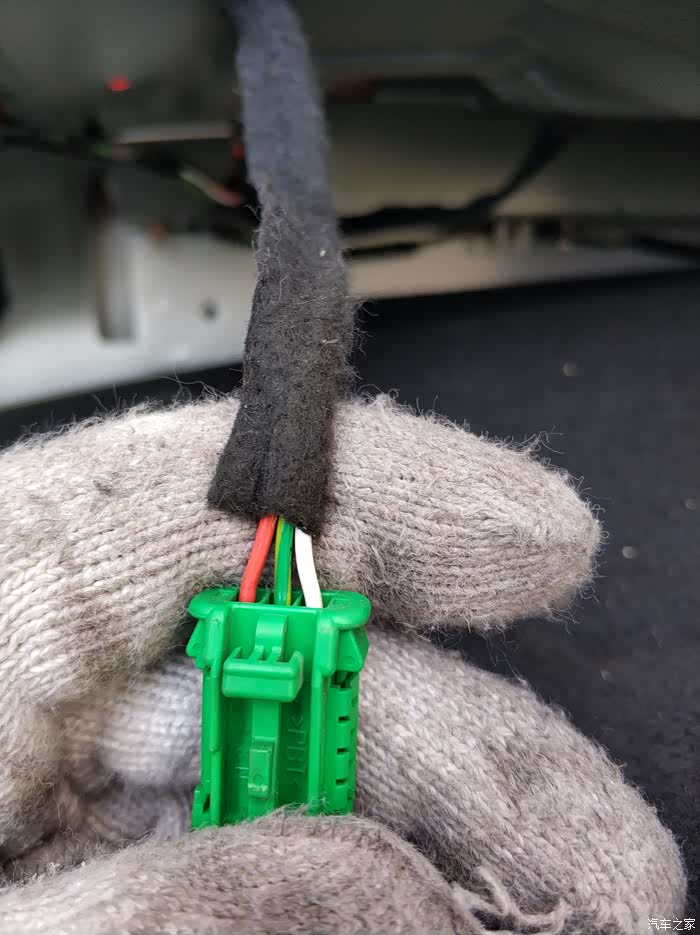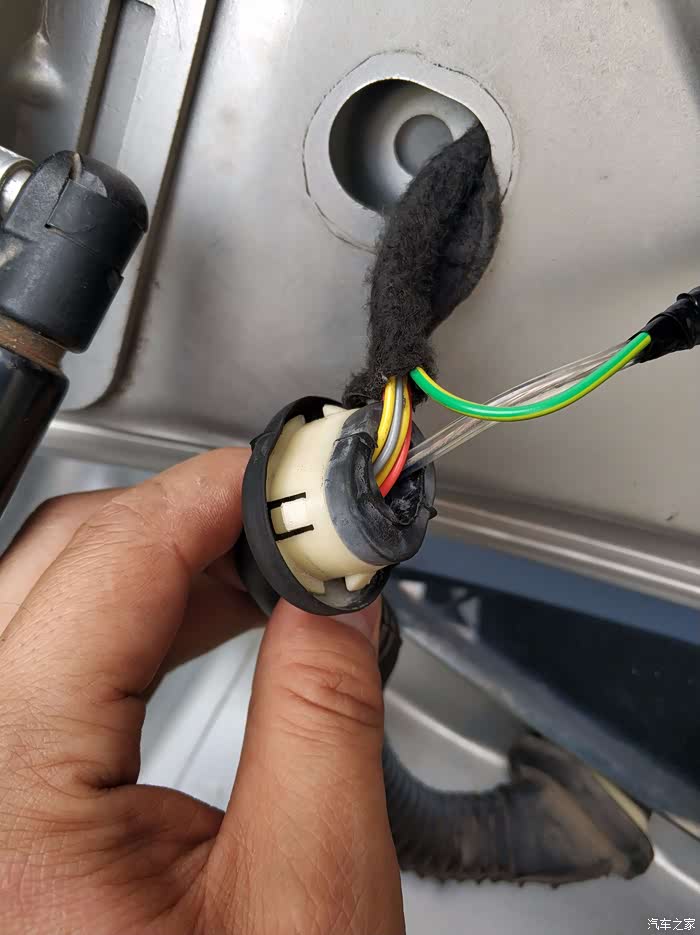 把后备箱锁的线束插头拔下来对比一看,插头中间的这根线就是黄绿相间的和断了的那根是一根线。