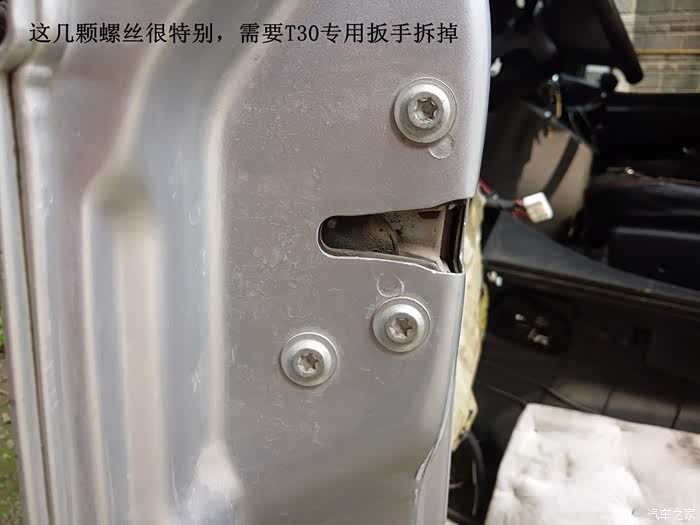 车门锁的螺丝有点特别,需要专用的T30内六角扳手才能搞定。