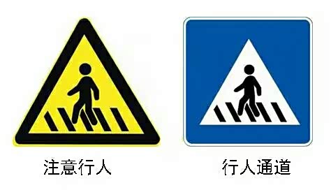 两者主要是提醒注意行人。黄底图标一般是行人比较多的地方,但是不一定有人行横道;白底图标是前方有人行横道,注意有行人。