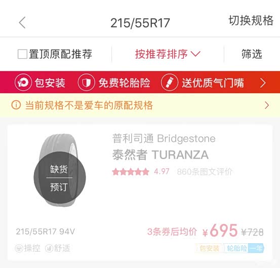 不过朋友在电话里说小酷的轮胎是个比较冷门的尺寸,不是每家养护店都能订到,让我一边问店家能不能定,他那边也帮我在途虎上找找,结果是果然没有。但是朋友说这款原厂轮胎是普利司通的泰然者系列,抓地力好,耐磨度各方面都很均衡,是小酷的最佳拍档,因此不建议更换其他品牌,再说如果一条轮胎尺寸或花纹和另外三条不一样也对开车安全不不利。