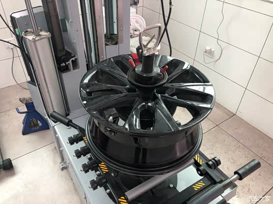 新轮胎来了,直接开装,同样是擦油脂然后机器压压按按一整套,最后充气,全搞定。(我是不会告诉你充气时我被嘭嘭两下声音吓到两次的)