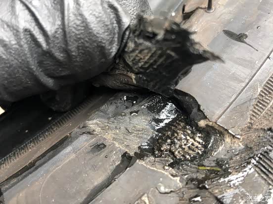 上了举升机才发现,原来是轮胎内壁破了,可是我打破脑袋也想不起来是怎么搞的。师傅说已经伤到轮胎侧面的钢丝了(轮胎里竟然有钢丝,好神奇),没办法补,必须更换。我心想朋友介绍的店应该不会坑人吧,于是在和朋友再次电话后,就同意了。